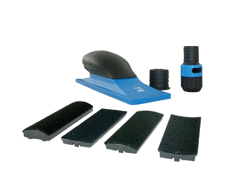 Hebel ręczny 70 mm x 198 mm z odsysem. Posiada 4 wymienne stopy, jedną płaską i 3 zakrzywione, co umożliwia szlifowanie prostych I dopasowanie do różnych zaokrąglonych powierzchni. System odciągu urobku, z różnymi łącznikami